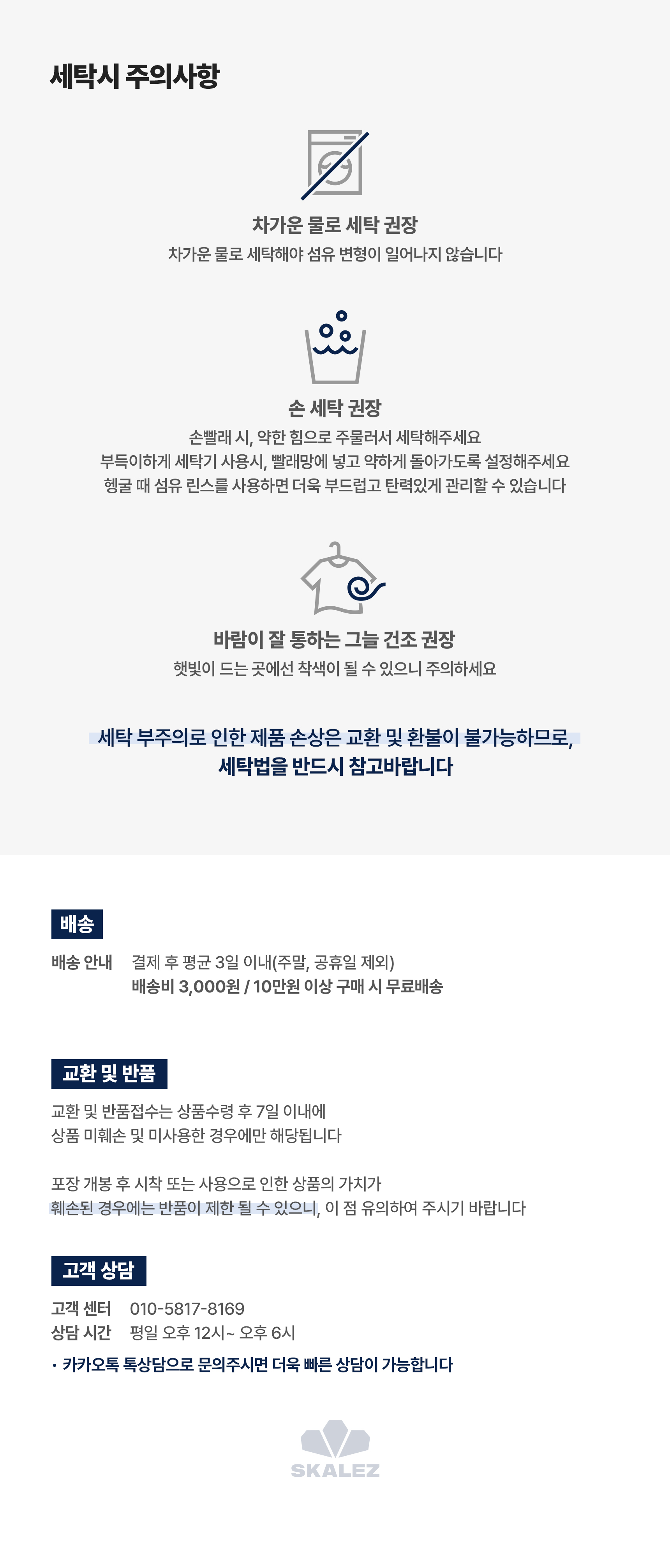 - 단독세탁, 찬물세탁, 손세탁 권장 (세탁기 사용 시 뒤집어서 세탁 권장)